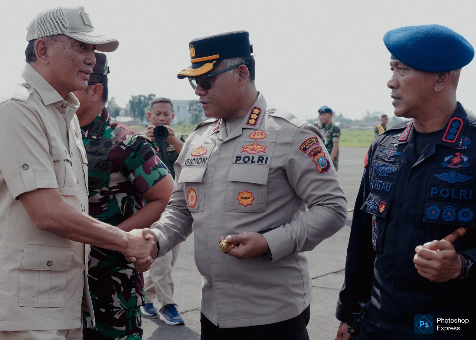 MEDAN – Kapolrestabes Medan Kombes Pol Gidion Arif Setyawan memimpin langsung penyambutan kedatangan Menteri Pertahanan RI Letnan Jenderal (Purn) Sjafrie Sjamsoeddin di Lanud Soewondo, Medan.