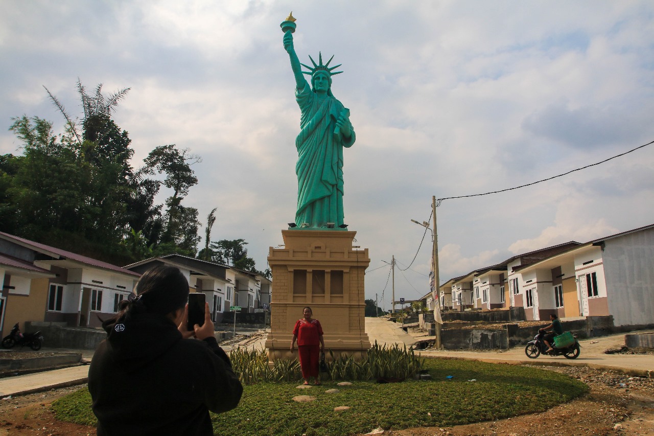 Warga berfoto di depan patung miniature Liberty yang berada di komplek perumahan Jordan (Johor Medan) di Namorambe, Deliserdang, Sumut, Senin 19 Februari 2024. Saat ini Bank BTN menjadi penguasa pasar pembiayaan dengan beragam solusi KPR yang lengkap dan terpercaya untuk kebutuhan masyarakat. KADRI BOY TARIGAN