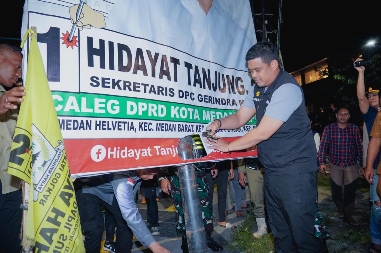 MEDAN l Wali Kota Medan Bobby Nasution pimpin penertiban Alat Peraga Kampanye (APK) di persimpangan Jalan Putri Hijau dan Guru Patimpus, Minggu (11/2/2024) dinihari. Penertiban Alat Peraga Kampanye (APK) di seluruh Kota Medan menyusul masuknya masa tenang.