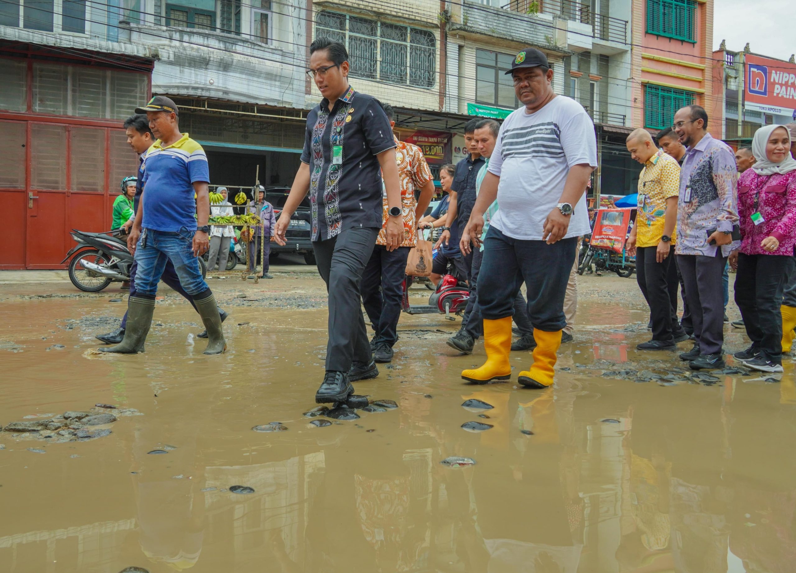 MEDAN – Walikota Medan Rico Waas meninjau langsung kondisi Jalan Sunggal, persisnya di sekitar Pasar Sunggal yang rusak parah, kemarin.