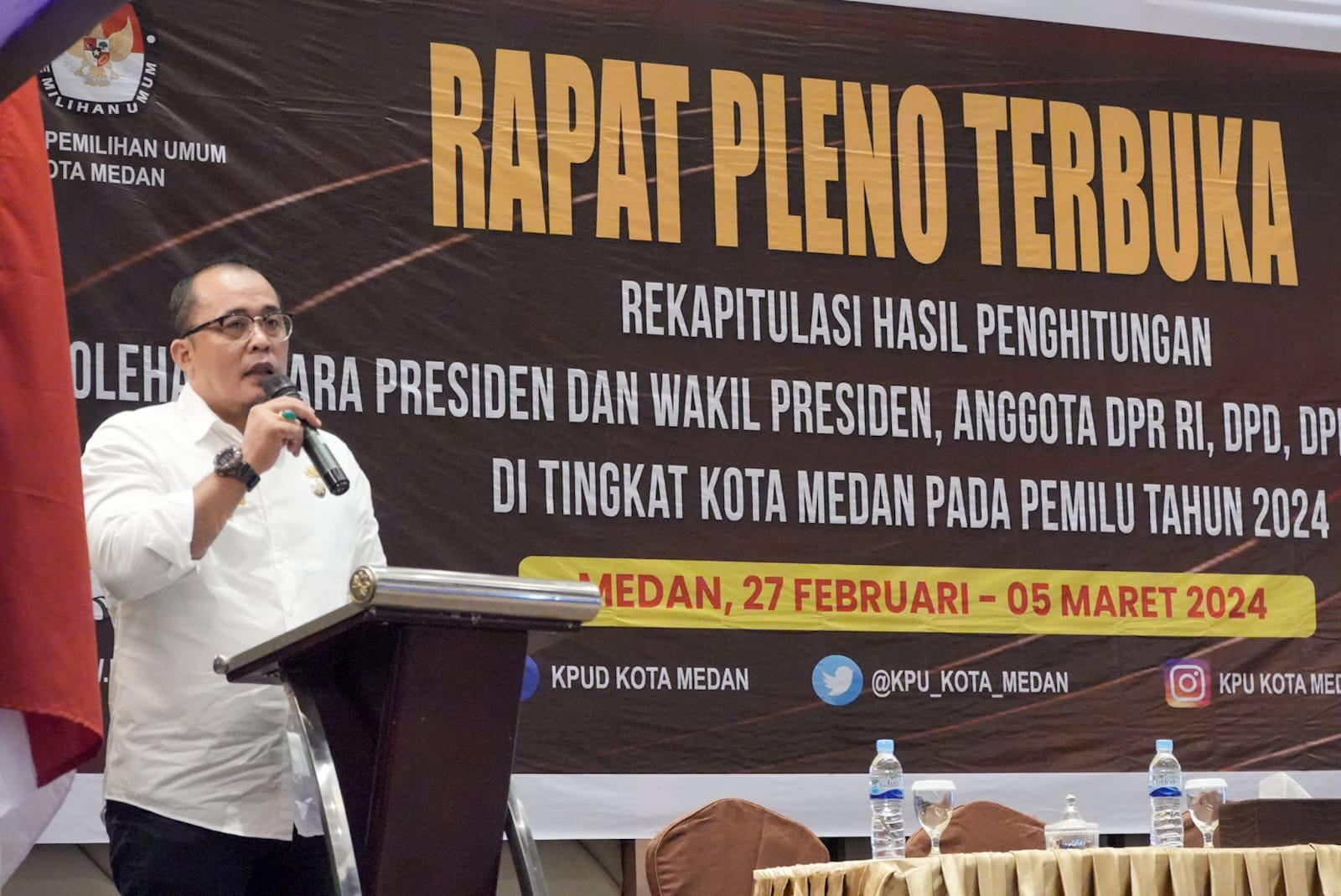 “Alhamdulillah, pemilu kondusif,” ucap Aulia pada pembukaan Rapat Pleno Terbuka Rekapitulasi Hasil Penghitungan Perolehan Suara Pemilu 2024 Tingkat Kota Medan, Selasa (27/2/2024) di Hotel LePolonia.