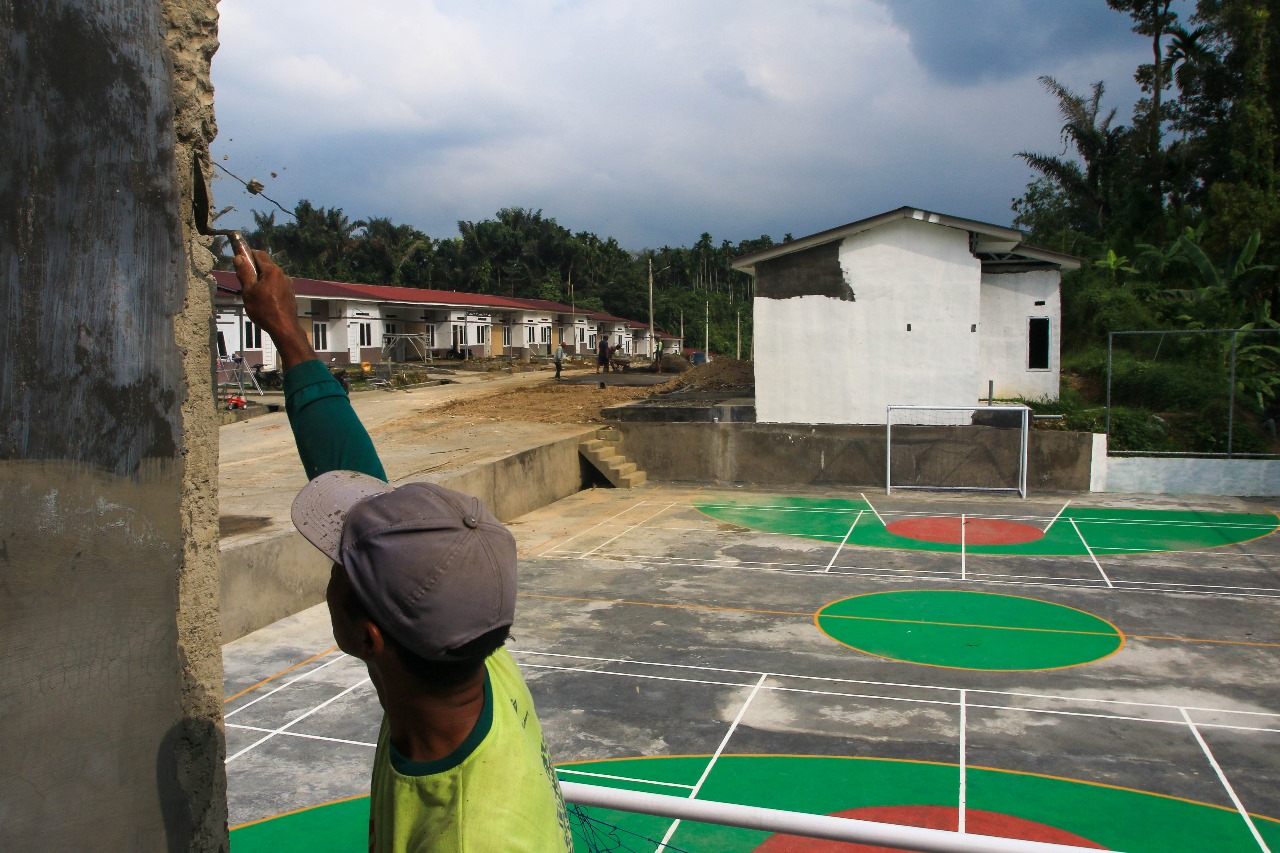 Tukang menyelesaikan proyek pembuatan rumah subsidi dengan latar belakang fasilitas umum berupa lapangan futsal di komplek perumahan Jordan (Johor Medan) di Namorambe, Deliserdang, Sumut, Senin 19 Februari 2024. Saat ini Bank BTN menjadi penguasa pasar pembiayaan dengan beragam solusi KPR yang lengkap dan terpercaya untuk kebutuhan masyarakat. KADRI BOY TARIGAN