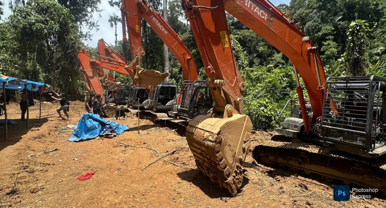 Aktivitas tambang ilegal dengan puluhan ekskavator telah menggerus bukit, merusak aliran sungai, dan mengancam kawasan hutan lindung.