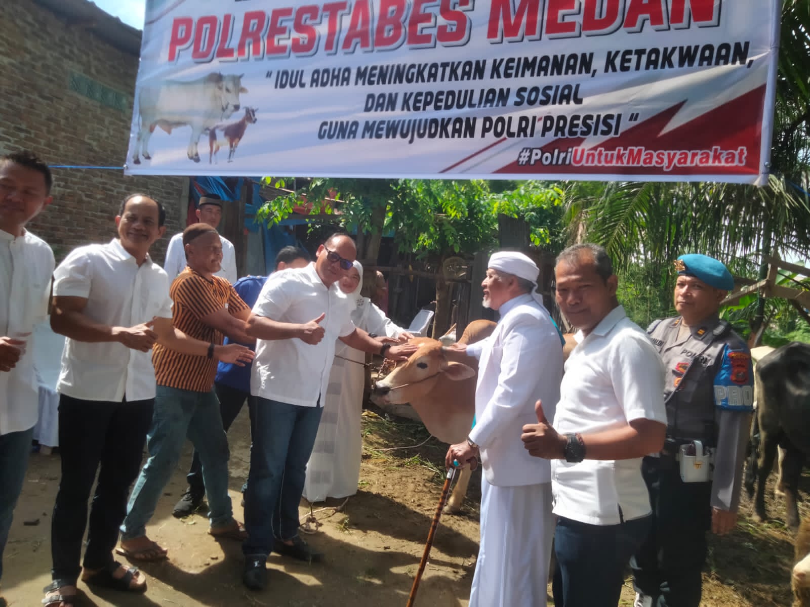 Medan – Kapolrestabes Medan Kombes Pol Dr. Gidion Arif Setyawan, SIK, M.Hum melalui Kabag Sumda Kompol Chandra, menyerahkan 14 ekor lembu qurban kepada warga Kota Medan dalam rangka menyambut Hari Raya Idul Adha 1446 H.