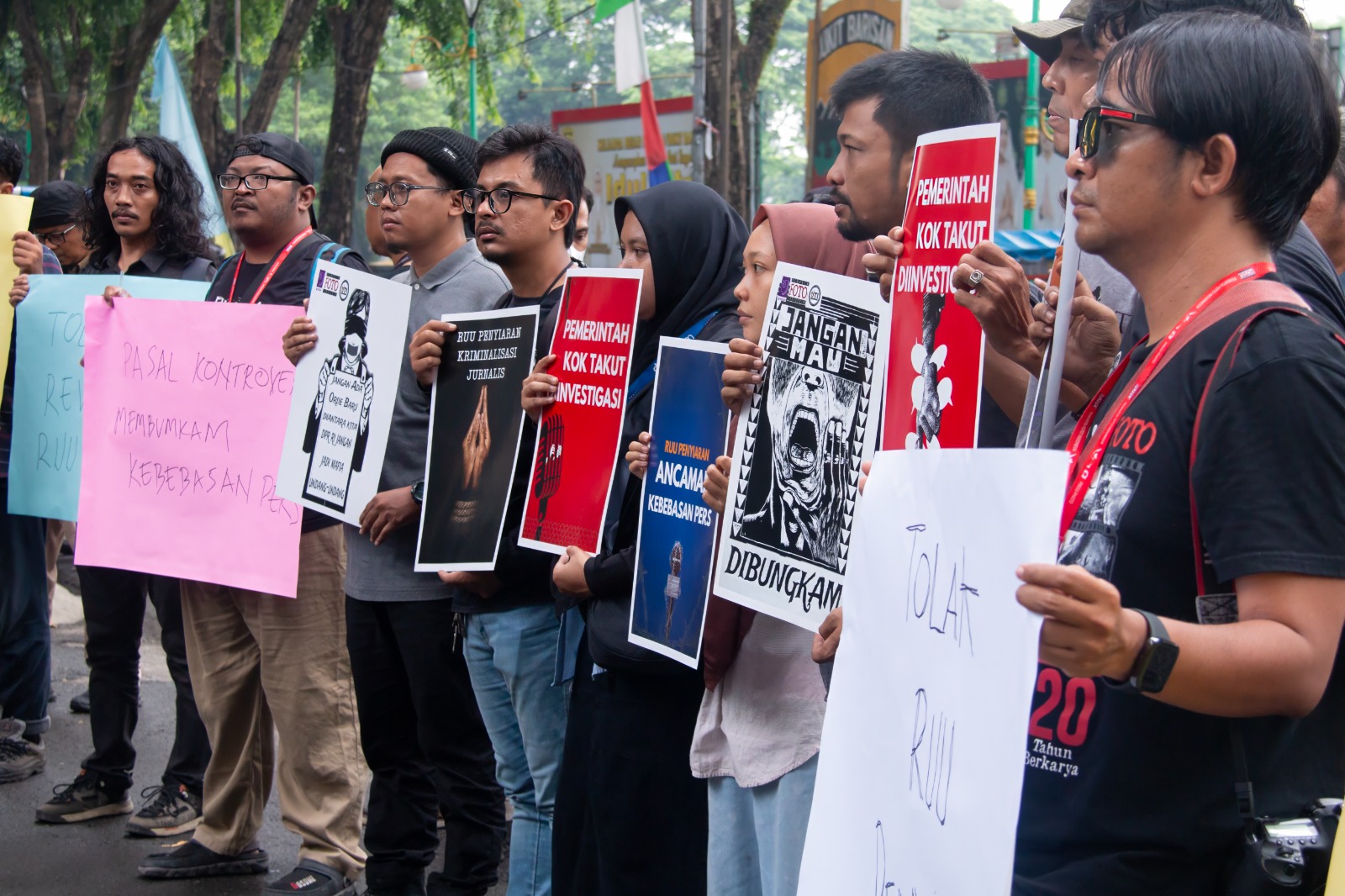Para jurnalis membentangkan spanduk, poster berisikan kata kata penolakan terhadap RUU Penyiaran. Para jurnalis resah dengan aturan baru yang akan disahkan beberapa bulan ke depan.