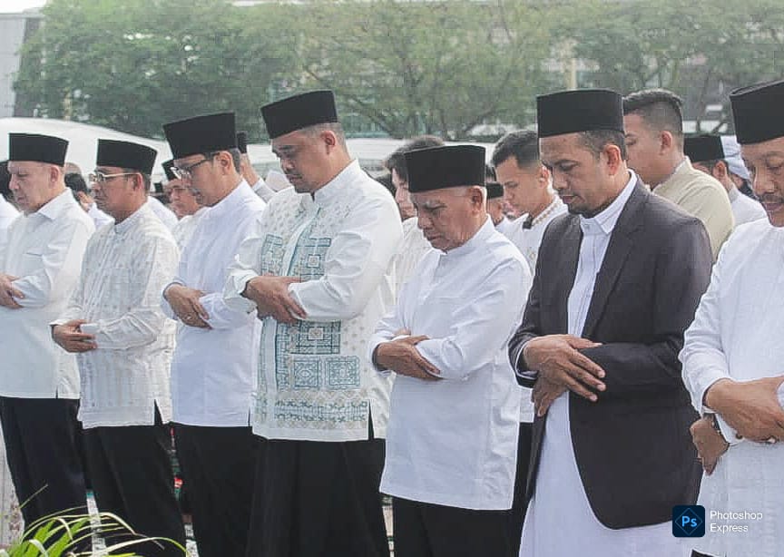 Salat yang diimami qori internasional Ahmad Azroi Hasibuan dan dikhutbahi Ketua MUI Medan Hasan Matsum ini dihadiri Gubernur Sumut Bobby Nasution, Kahiyang Ayu, serta jajaran Forkopimda.