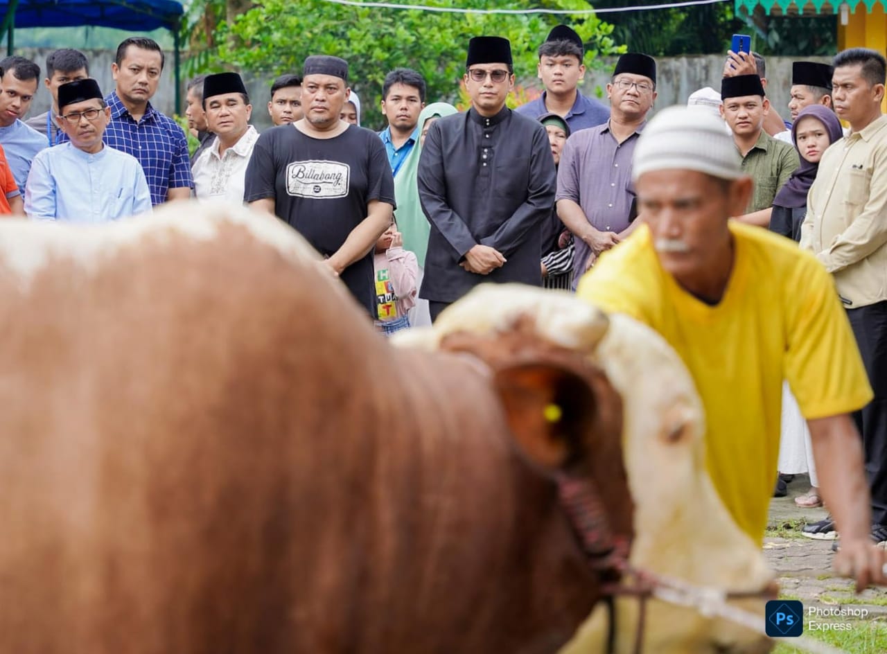 MEDAN – Wali Kota Medan, Rico Tri Putra Bayu Waas hadir dalam penyembelihan sapi kurban pemberian Presiden Prabowo Subianto di halaman belakang Masjid Raya Al Osmani, Medan Labuhan, Sabtu (7/6/2025). Kegiatan ini berlangsung meriah dengan antusiasme warga yang memadati lokasi.