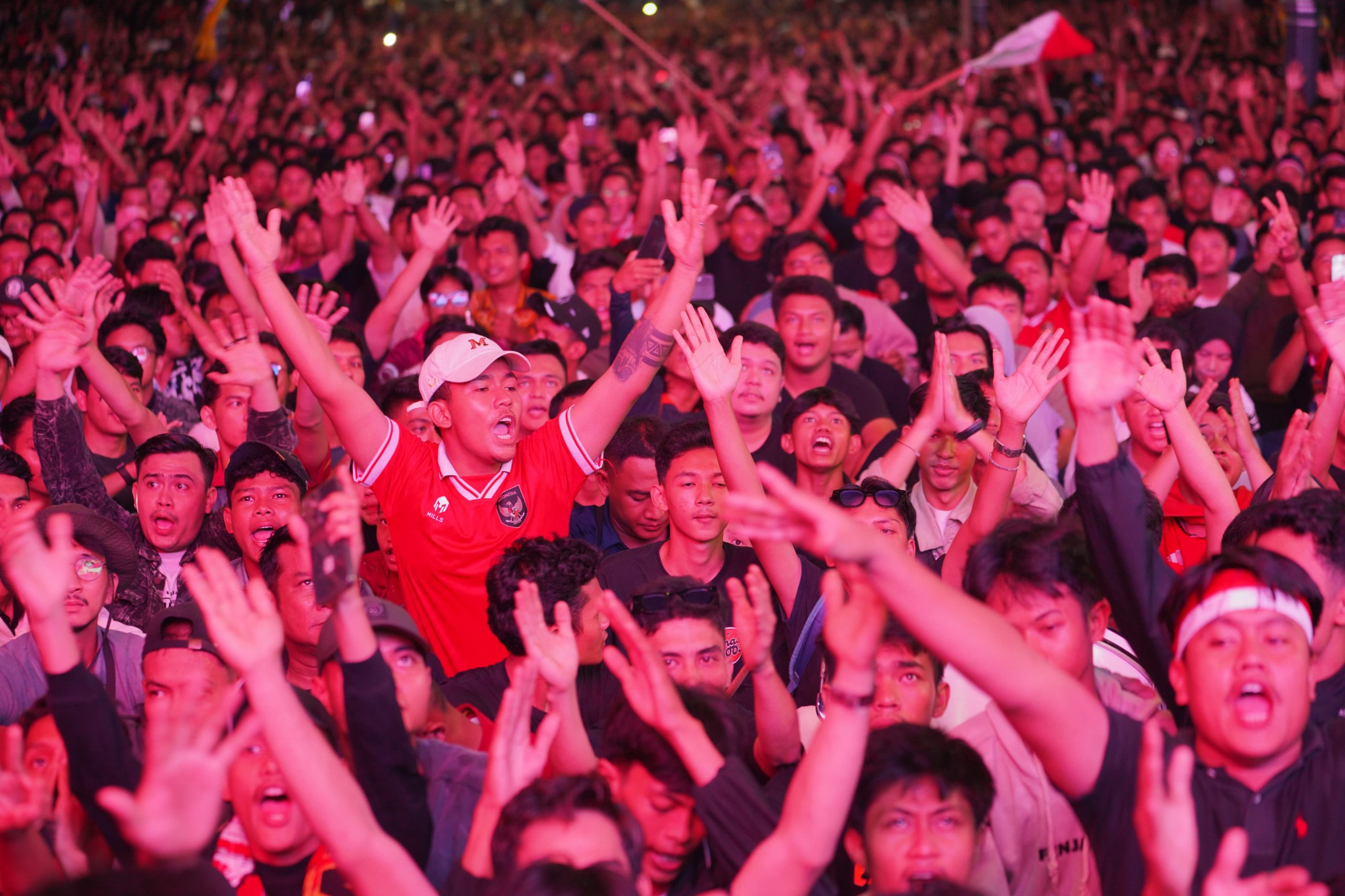 MEDAN – Ribuan pendukung Timnas Indonesia U-23 tumpah ruah nonton bareng laga melawan Uzbekistan U-23 di kawasan Kesawan, Kecamatan Medan Barat, Senin (29/4/2024).